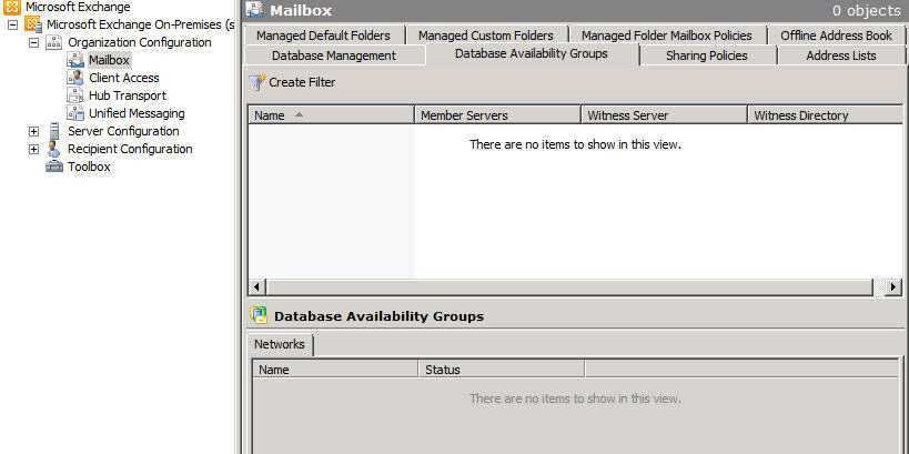 Откройте Exchange Management Console (EMC) и перейдите в Organization Management > Mailbox. Зайдите в вкладку Database Availability Group. Как вы видите сейчас она пустая.