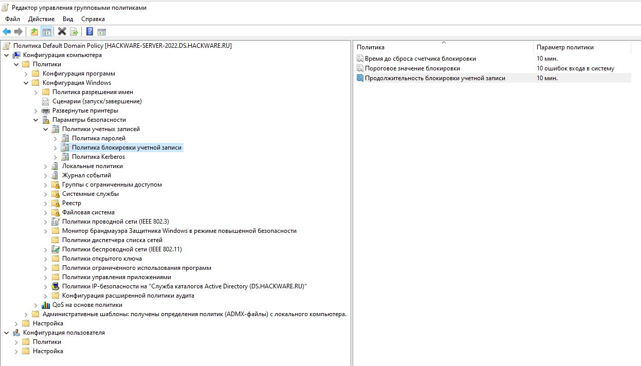 Политики блокировки учётных записей обычно устанавливаются в Default Domain Policy для всего домена с помощью оснастки gpmc.msc. Необходимые политики можно найти в Computer configuration→ Policies→ Windows Settings → Security Settings → Account Policies → Account Lockout Password (в русскоязычной версии это соответственно Конфигурация компьютера → Политики → Конфигурация Windows → Параметры безопасности → Политики учетных записей → Политика блокировки учётной записи). Это следующие политики: