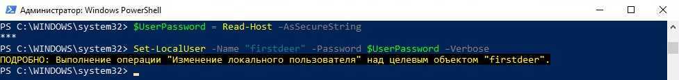 В моём случае, я меняю пароль пользователю — firstdeer.указал -Verbose для вывода сообщения «ПОДРОБНО:…»(Рис.8):