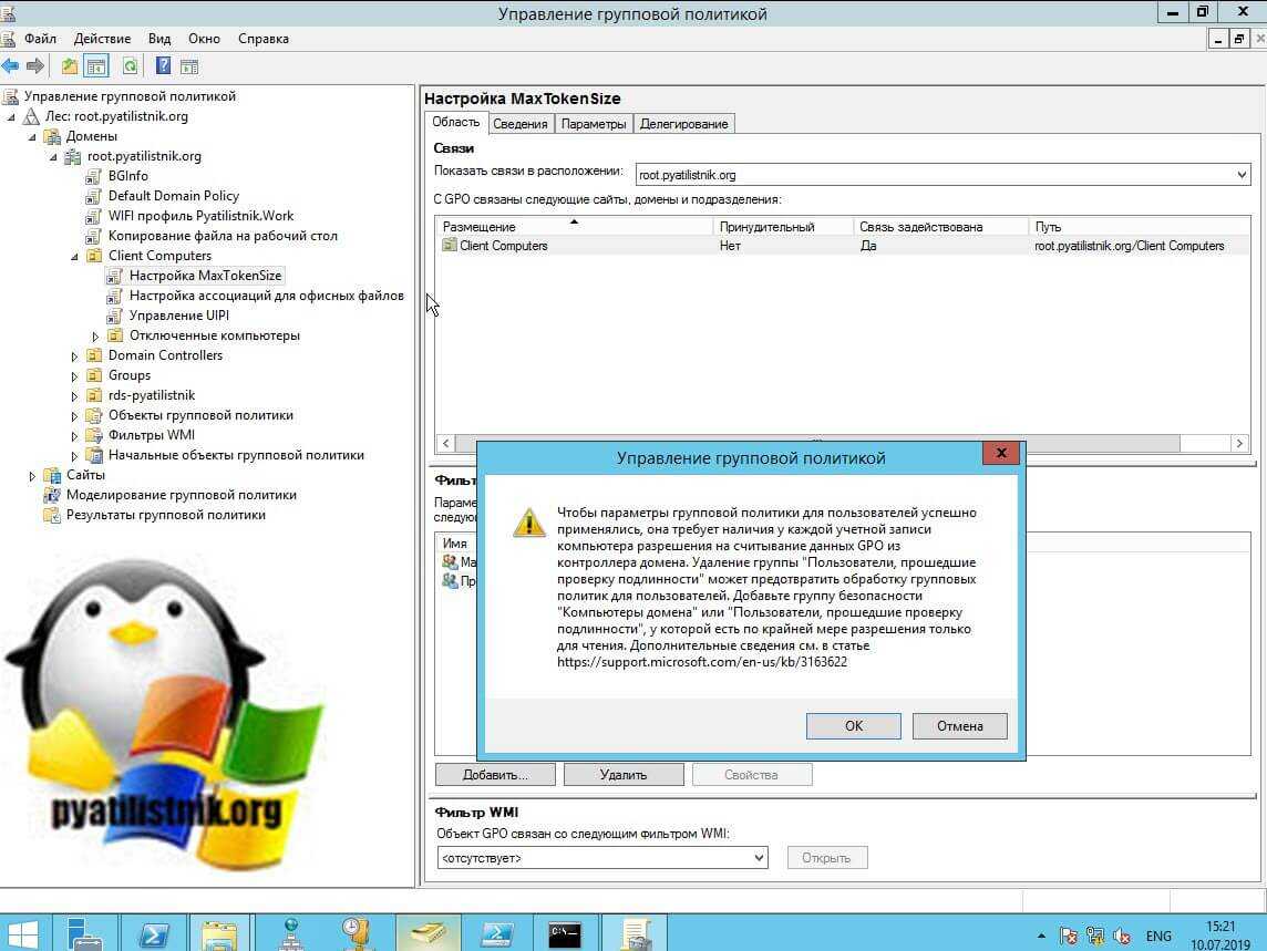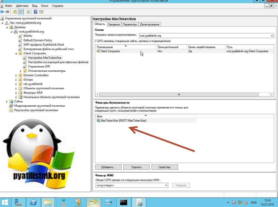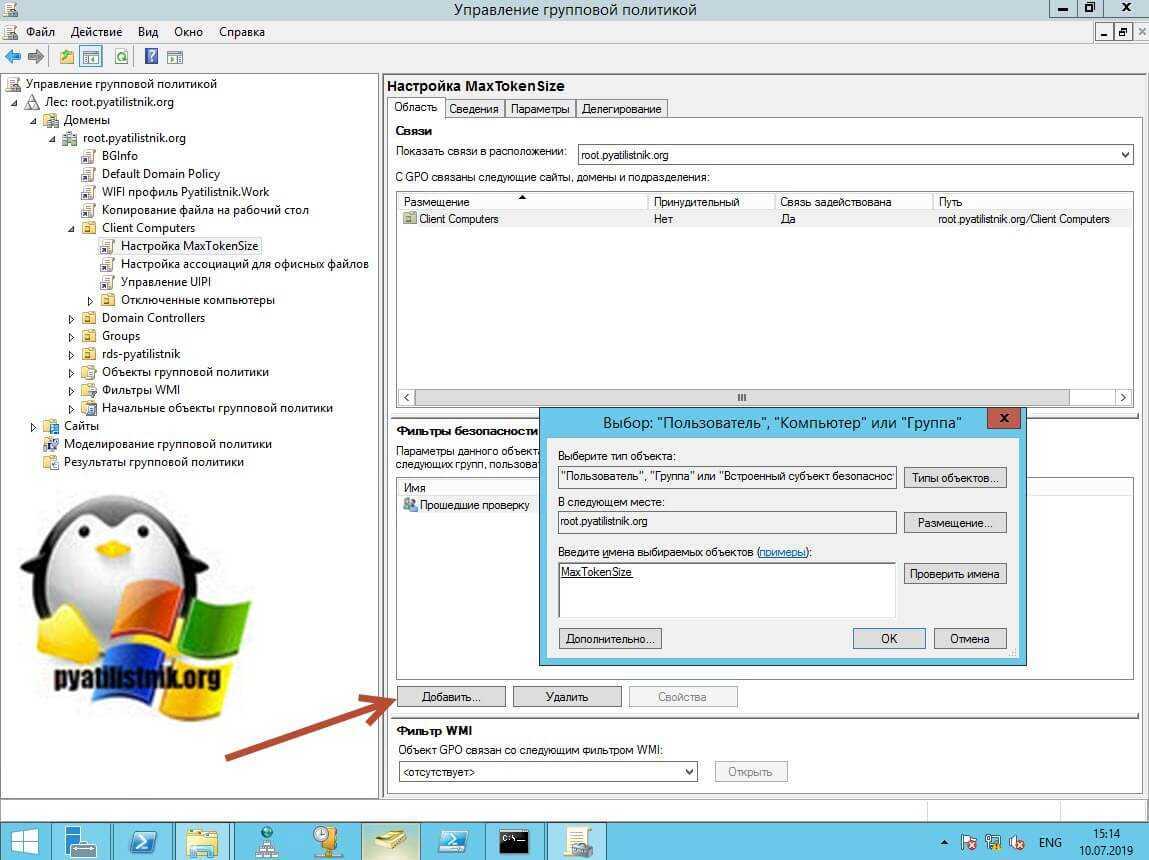 то вы можете их добавить в данный фильтр, после чего нужно удалить группу «Прошедшие проверку (authentication user)», так как в нее входят все пользователи и компьютеры домена. Давайте это попробуем. Открываем оснастку «Управление групповой политикой». В прошлый раз я создавал политику «Настройка MaxTokenSize» в задачи которой входило изменение размера токена kerberos. Предположим, что я хочу применить ее только в локальной доменной группе MaxTokenSize. Для этого я нажимаю кнопку «Добавить» в области «Фильтры безопасности», находим ее и нажимаем «Ok».
