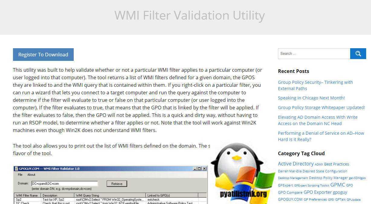 Скачать WMI Filter Validation Utility 1.1 можно на официальном сайте https://sdmsoftware.com/gpoguy/free-tools/library/wmi-filter-validation-utility/, но там от вас потребуется регистрация. Если не хотите, это делать, то можете загрузить WMI Filter Validation Utility у меня с сайта