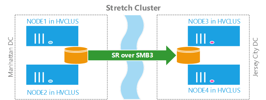 Stretch Cluster allows configuration of computers and storage in a single cluster, where some nodes share one set of asymmetric storage and some nodes share another, then synchronously or asynchronously replicate with site awareness. This scenario can utilize Storage Spaces with shared SAS storage, SAN and iSCSI-attached LUNs. It is managed with PowerShell and the Failover Cluster Manager graphical tool, and allows for automated workload failover.