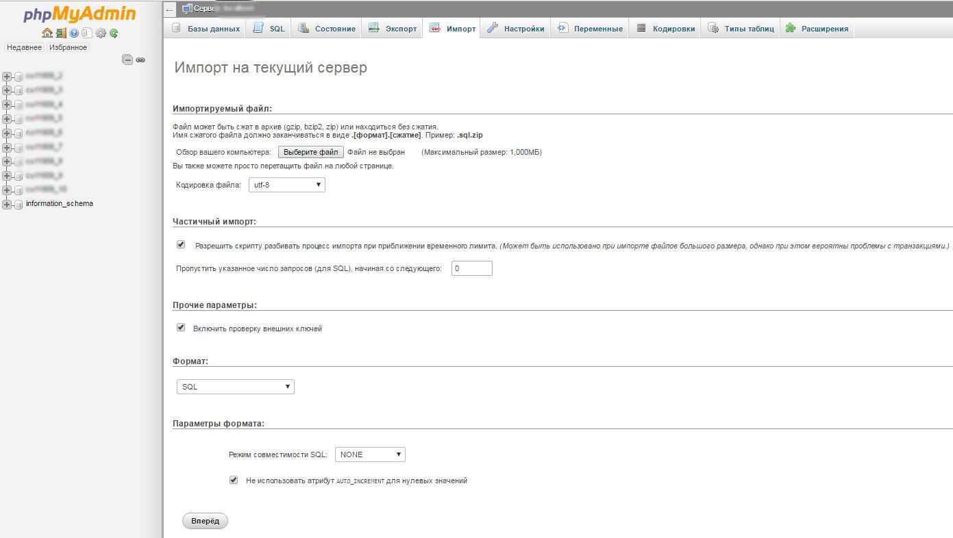 Выполнить импорт базы данных тоже совсем несложно. Как и в предыдущем случае, в списке слева выберите нужную вам базу данных, а затем перейдите во вкладку «Импорт».