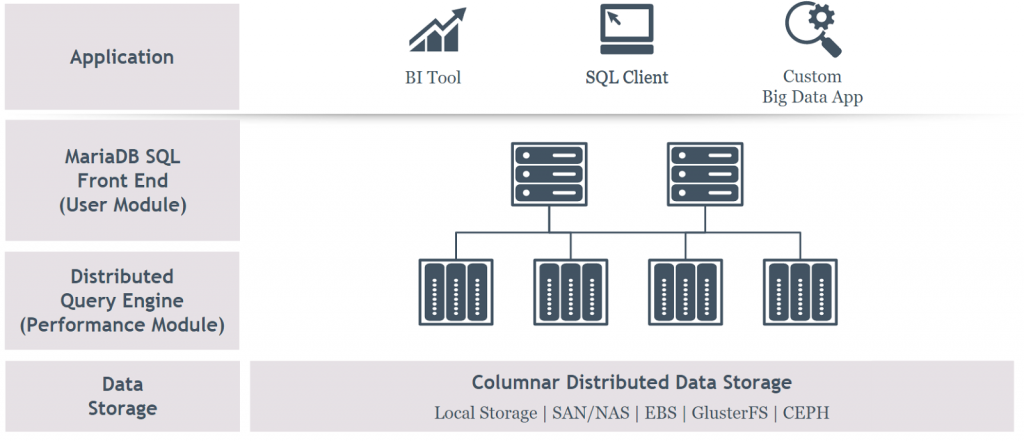 MariaDB предоставляет еще одно мощное улучшение производительности, достигаемое с помощью нового типа таблиц, представленных не в форме построчного хранилища, а в форме колоночного хранилища. Колоночные хранилища часто используются в аналитике больших данных. MariaDB позволяет масштабировать хранилище данных до петабайтного размера, обспечивая линейное повышение производительности запросов к хранимых данным при добавлении новых серверов.