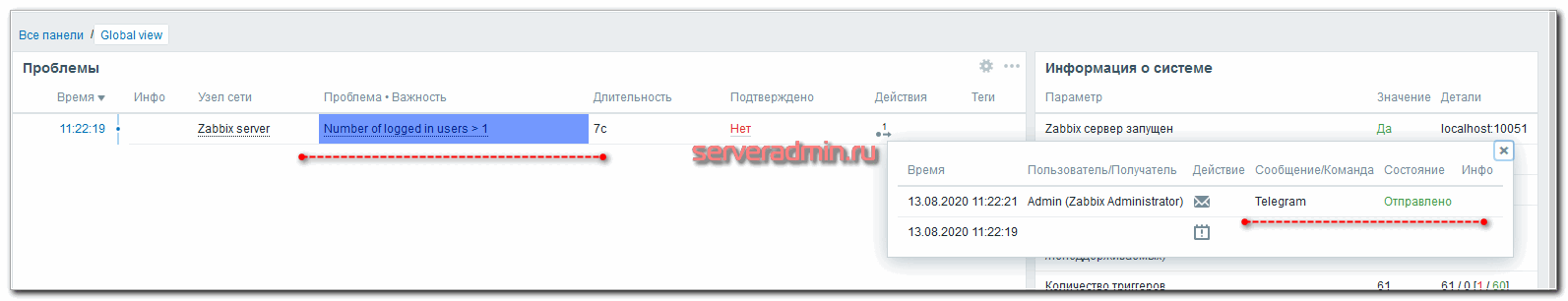 Итак, убедились, что сообщения в telegram нормально отправляются. С технической стороны проблем нет. Теперь настроим отправку уведомлений по событиям. Я обычно для этого использую тестовый триггер. В стандартном шаблоне zabbix для OS Linux есть элемент данных Number of logged in users, который считает количество залогиненных пользователей. Я для него делаю триггер, чтобы он срабатывал, когда пользователей 2 и более. И с его помощью тестирую уведомления, просто подключаясь на сервер по ssh двумя подключениями одновременно.
