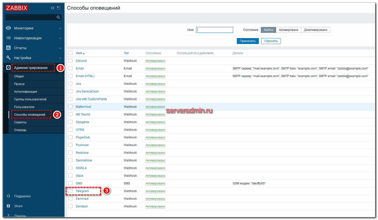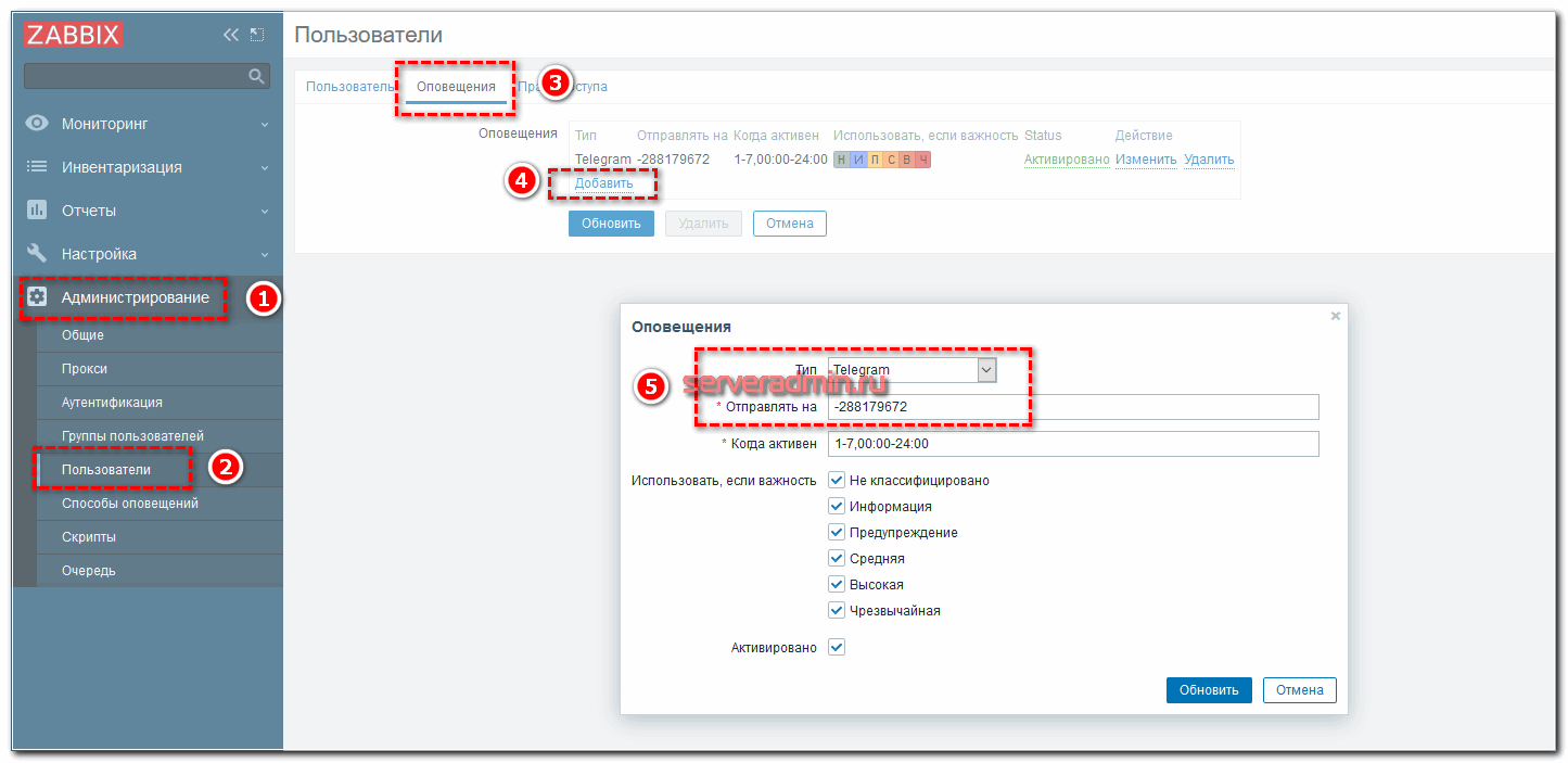 Теперь идем в настройки пользователя и добавляем ему способ оповещений через telegram.