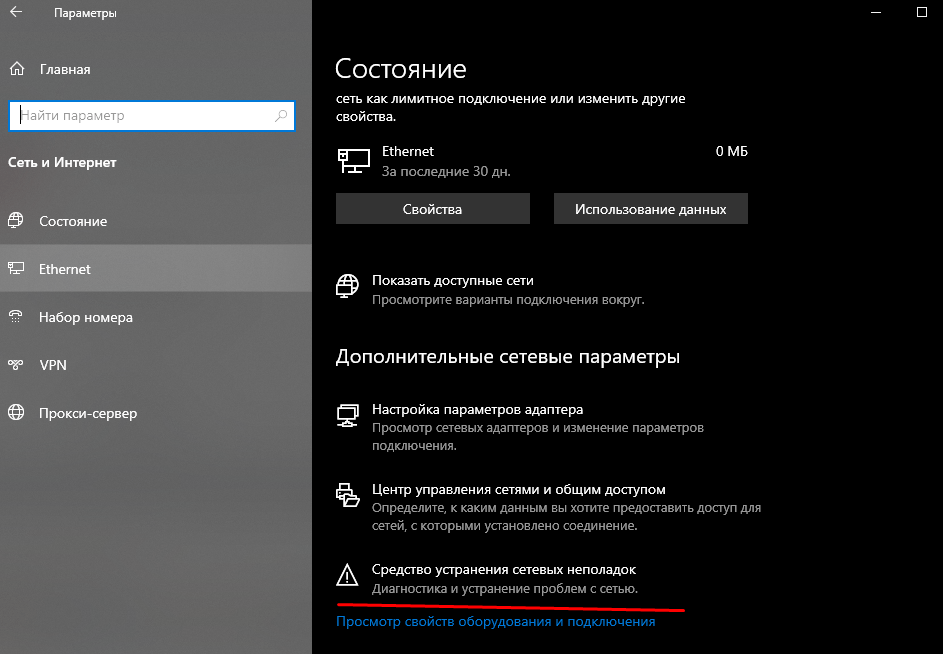 - Кликните ЛКМ по пункту «Средство устранения сетевых неполадок».