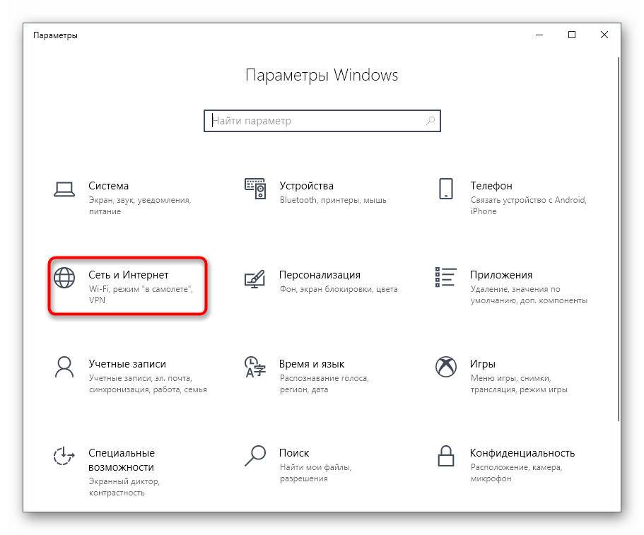 В итоге у вас откроется окно Параметры windows, его так же можно вызвать сочетанием клавиш WIn+I (это такие горячие сочетания клавиш windows 10). Выбираете пункт Сеть и Интернет.