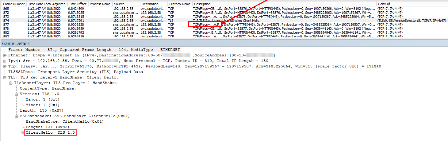 В сетевом захвате кадр 874 — это пакет Client Hello, использующий TLS 1.0. Frame 877 — это ответ сервера. Ответ включает флаги ACK (A) и RST (R). Так как конечная точка поддерживает только подключения TLS 1.2, она отказано в подключении и выдает https://sws.update.microsoft.com ответ сброса.