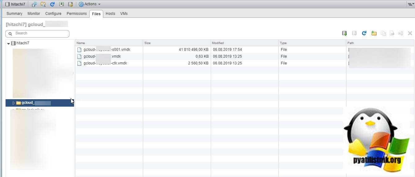 Первым делом вам нужно зайти на датастор на котором у вас лежит ваша виртуальная машина и сделать просмотр файлов. Для того, чтобы удостовериться, что виртуальная машина располагает виртуальные диски именно там, я вам советую проверить информацию в дополнительных свойствах виртуального диска и посмотреть поле «Disk File».