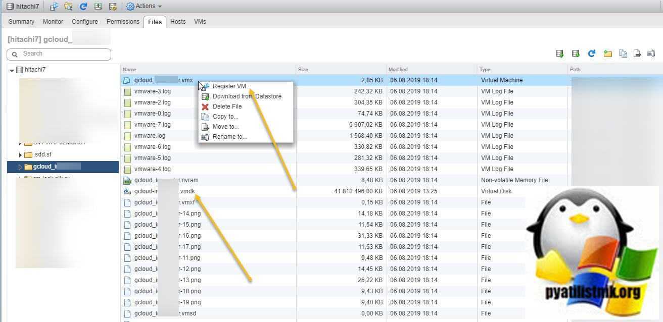 Далее вы переносите нужные файлы, после чего необходимо заново зарегистрировать виртуальную машину. Для этого кликаем по файлу с расширением vmx и выберите пункт «Register VM». Указываем нужный датастор и хост Vmware ESXI на котором будет зарегистрирована виртуалка.