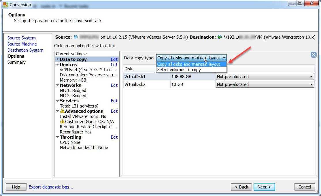 - Уменьшение размера виртуального диска путем конвертации виртуальной машины с помощью VMware vCenter Converter (при конвертации указывается размер получаемого диска меньший, чем исходный)