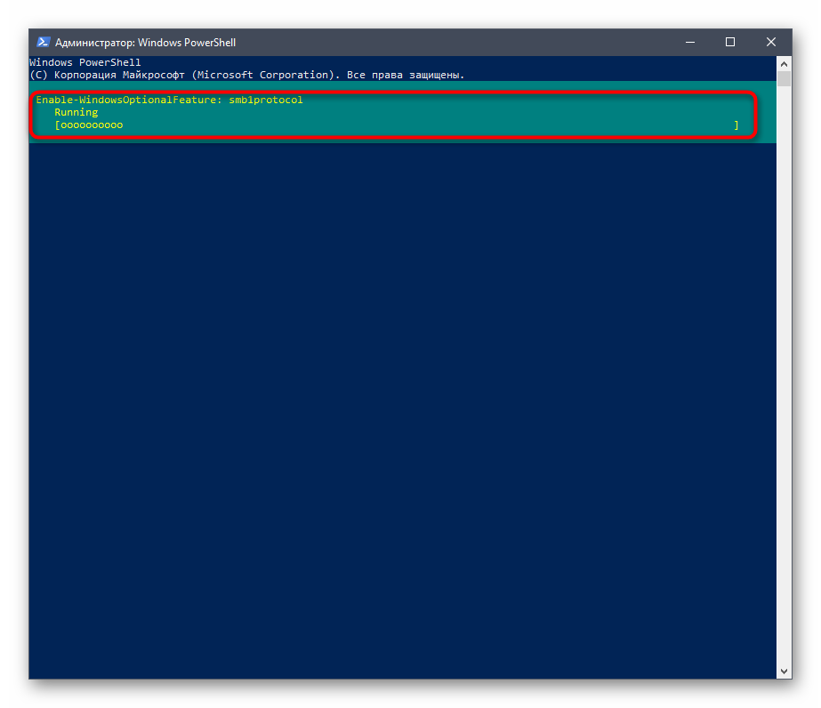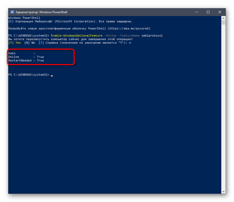 Далее в PowerShell отобразится информация о том, что SMBv1 была успешно активирована и находится в рабочем состоянии.