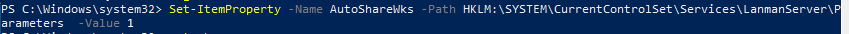 reg add HKLM\SYSTEM\CurrentControlSet\Services\lanmanserver\parameters /f /v AutoShareWks /t REG_DWORD /d 0