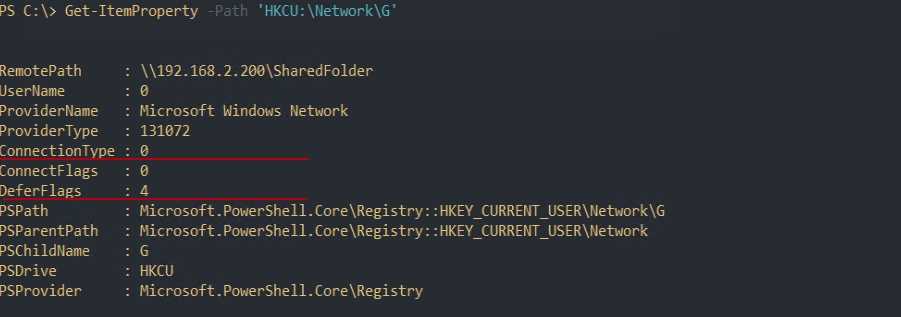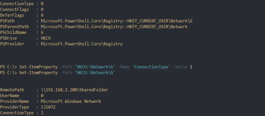 Рабочий способ сделать этот диск постоянным — отредактировать его через реестр. Ветка, под которой был подключен диск, будет иметь следующий путь »HKCU:\Network\G». «G» в конце — это буква под который был подключен диск. Мы можем вернуть существующие значения следующей командой: