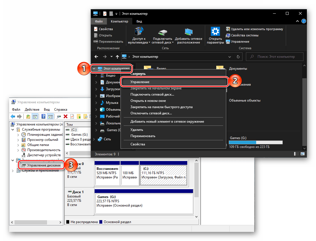 Однако по умолчанию в Виндовс 10 отключено отображение ярлыка «Этот компьютер» на рабочем столе, а потому если вы хотите использовать именно этот способ для запуска «Управления дисками», потребуется обратиться к «Проводнику». Откройте интегрированный в ОС файловый менеджер, например, нажав «WIN+E», отыщите на его левой панели ссылку «Этот компьютер» и проделайте то же, что и со значком – правый клик и выбор соответствующего пункта меню.