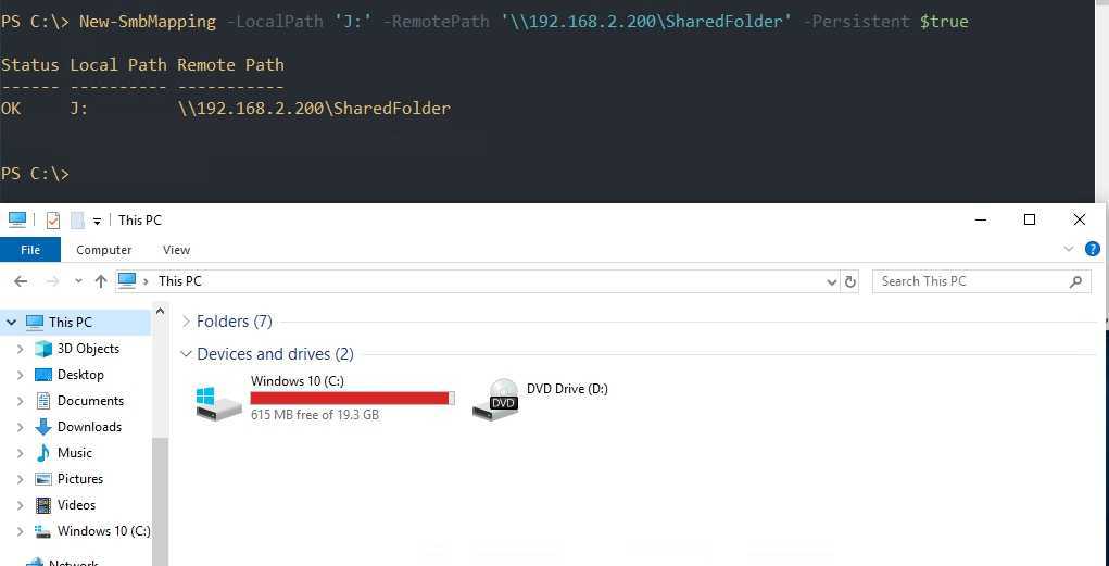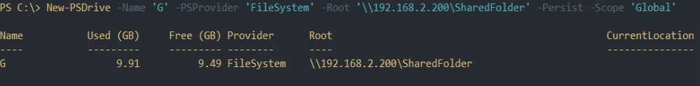 В отличие от предыдущего способа — у него нет проблем с проводником, но после перезагрузки компьютера подключение к диску пропадет. Как я прочитал в каких-то версиях Powershell это исправлено, в каких-то появились новые проблем. Один из способов сделать диск постоянным — будет рассмотрен ниже.