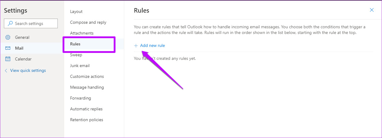 Шаг 2: Выберите Электронная почта на левой панели, а затем выберите Правила. Теперь нажмите на опцию Добавить новые правила и дайте имя новому правилу.