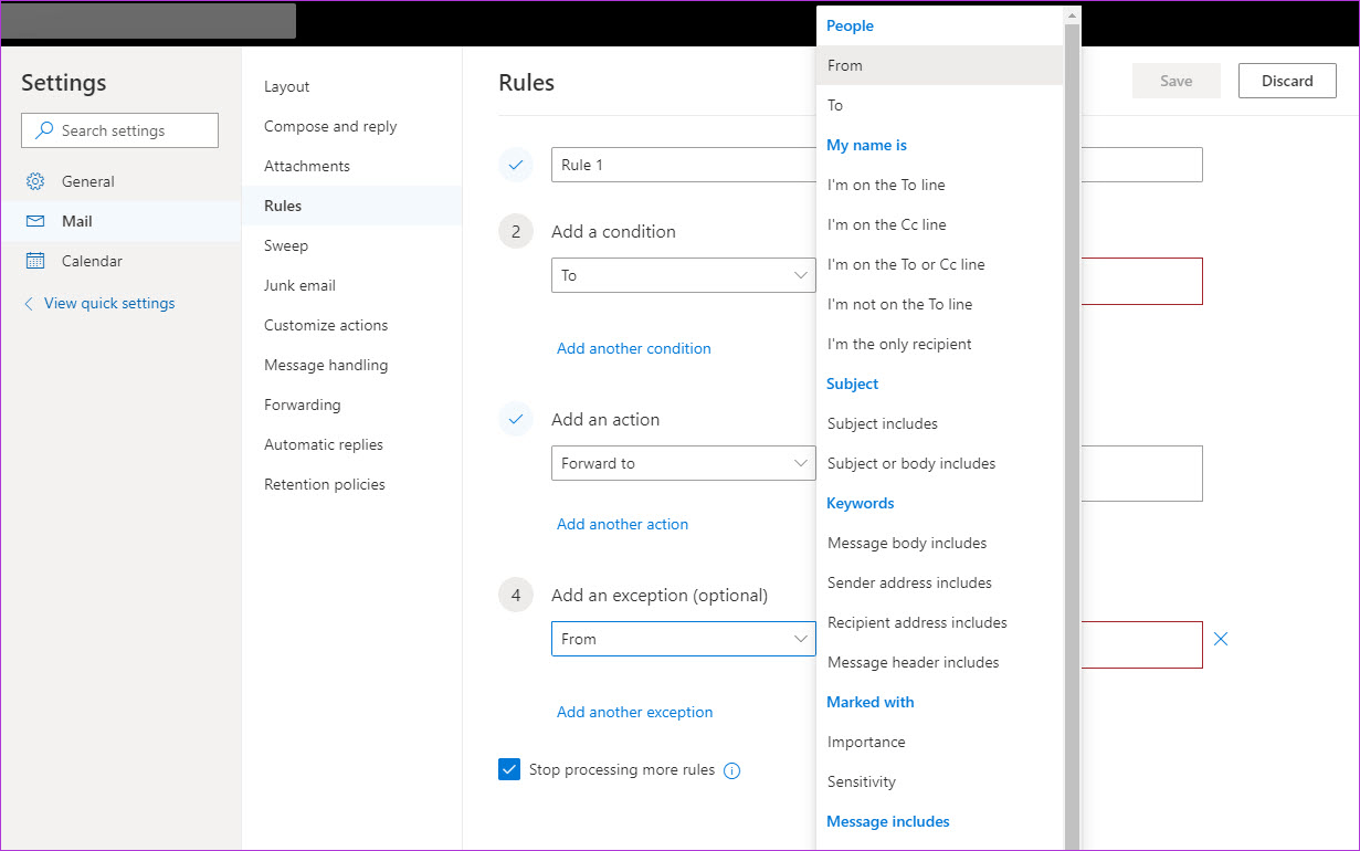 Шаг 4: Вы хотите правило электронной почты не срабатывать временами? Если да, нажмите Добавить исключение и введите необходимое условие.