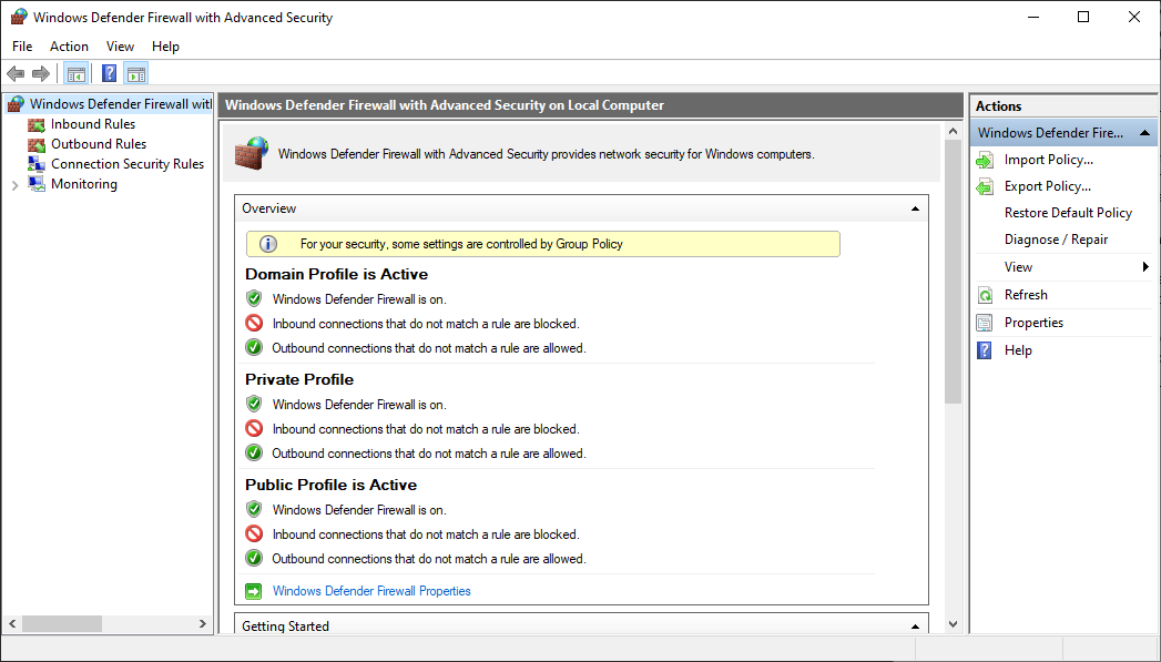 Поддержание параметров по умолчанию в Защитник Windows брандмауэра по мере возможности. Эти параметры предназначены для обеспечения безопасности устройства для использования в большинстве сетевых сценариев. Одним из ключевых примеров является поведение блока по умолчанию для входящие подключения.