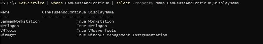 Не каждую службу можно приостановить (Pause) и восстанавливть. Что бы увидеть все службы, у которых есть такая возможность, выполните: