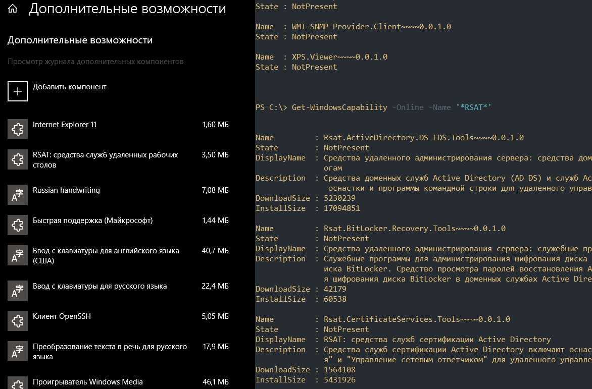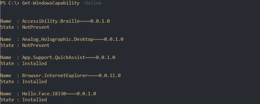 В предыдущем разделе было упомянуто о переезде многих компонентов в интерфейс Windows 10. Командлеты ‘WindowsCapability’ работают именно с ними. Если мы выполним следующую команду, которая очень похожа на предыдущую, то мы увидим совершенно разные пакеты: