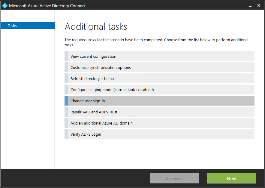 После начальной настройки Azure AD Connect с помощью мастера можно изменить метод входа пользователя с федерации на синхронизацию хэша паролей или сквозную аутентификацию, используя задачи, доступные в Azure AD Connect. Повторно запустите мастер Azure AD Connect. Отобразится список задач, которые можно выполнить. Из списка задач выберите Смена имени пользователя для входа.