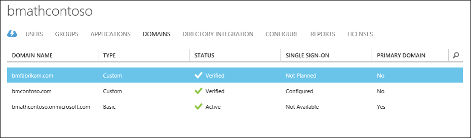Проблема возникает при добавлении нескольких доменов верхнего уровня. Предположим, что у вас настроена федерация между Azure AD и локальной средой. В этом документе используется домен bmcontoso.com. Теперь добавляется второй домен верхнего уровня, bmfabrikam.com.