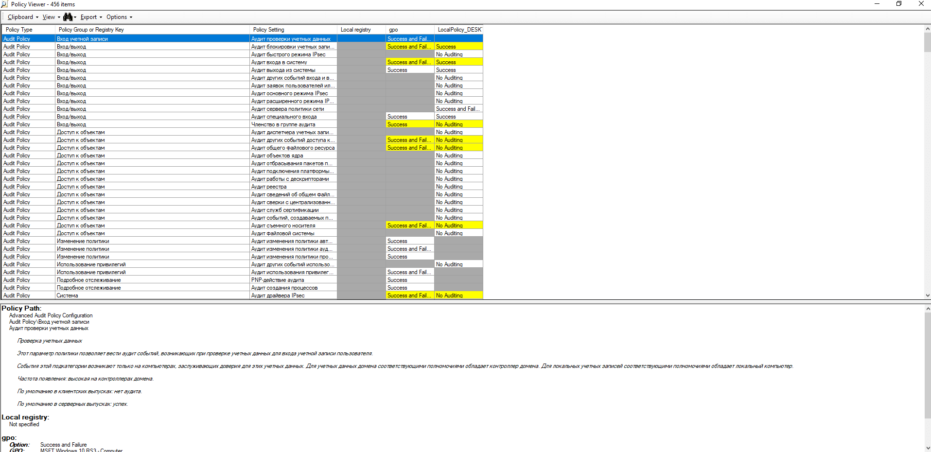 - Сравнение объектов групповой политики с текущей локальной политикой и параметрами локального реестра