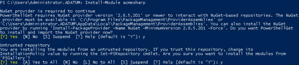 В процессе выполнения команды вам будет предложено установить NuGet. Согласитесь с его установкой, т.к. NuGet обеспечивает функции получения пакетов из PowerShell Gallery.