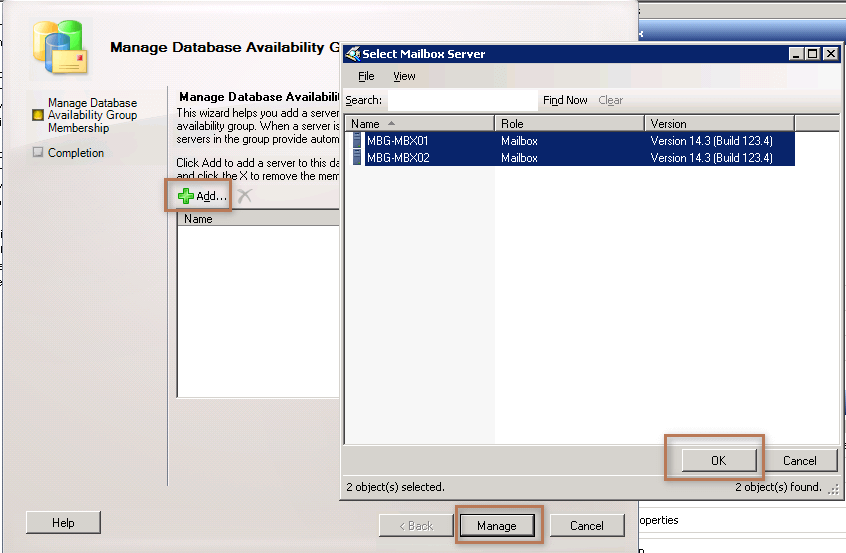 Click on the +Add button to add member serves to the DAG. As per my scenario I will be selecting both MBG-MBX01 and MBG-MBX02 and adding them to the DAG, and then Click Manage