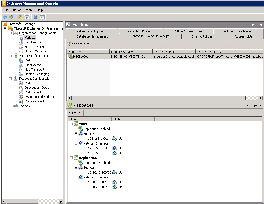 After adding both servers to the Database Availability Group, you will see the following in the Exchange Management Console: