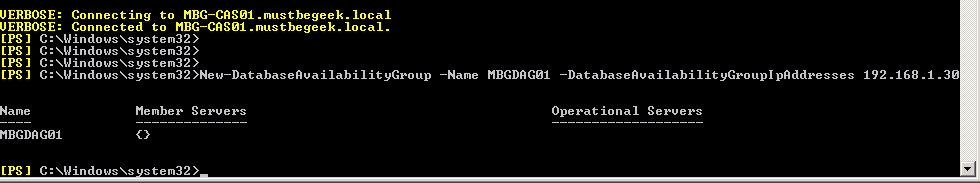 Add-DatabaseAvailabilityGroupServer -Identity MBGDAG01 -MailboxServer MBG-MBX02 Add-DatabaseAvailabilityGroupServer -Identity MBGDAG01 -MailboxServer MBG-MBX01