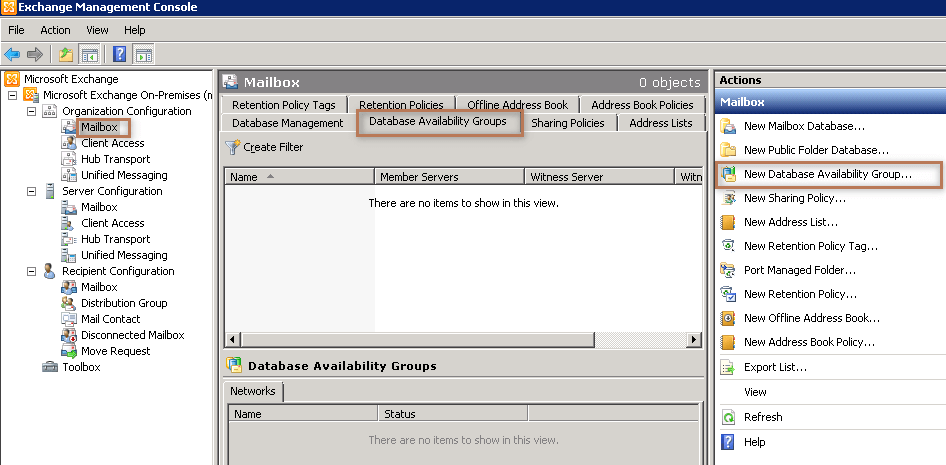 From the Console Root Select Organization Configuration → Mailbox. In the right panel click on Database Availability Tab. From the action pane click on New Database Availability Group.