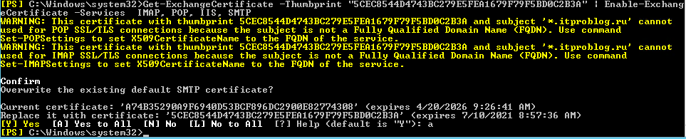 1. Запустим Exchange Management Shell на первом сервере Exchange 2016 и посмотрим на список наших сертификатов: