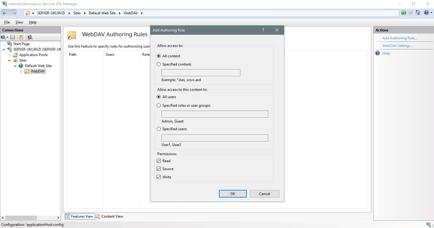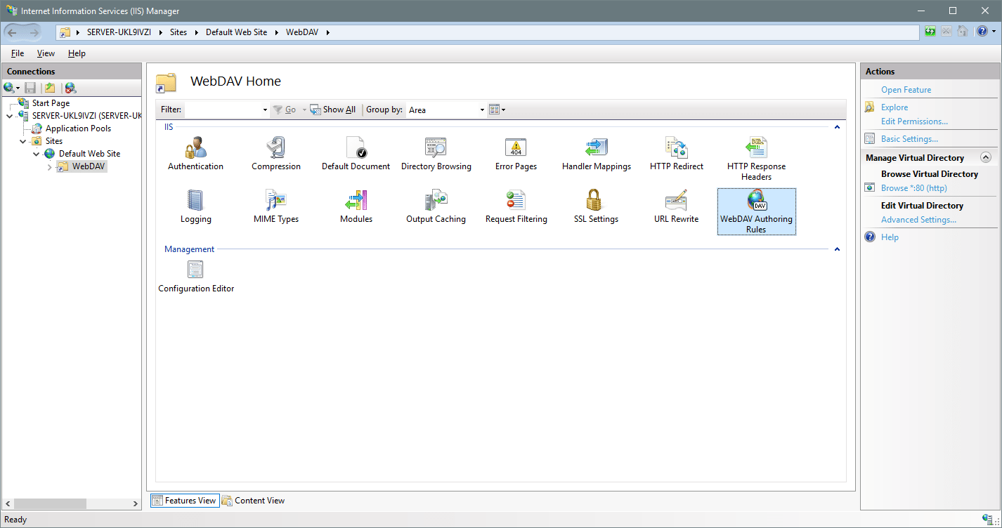Once WebDAV has been enabled, click the Add Authoring Rule task in the Actions pane.