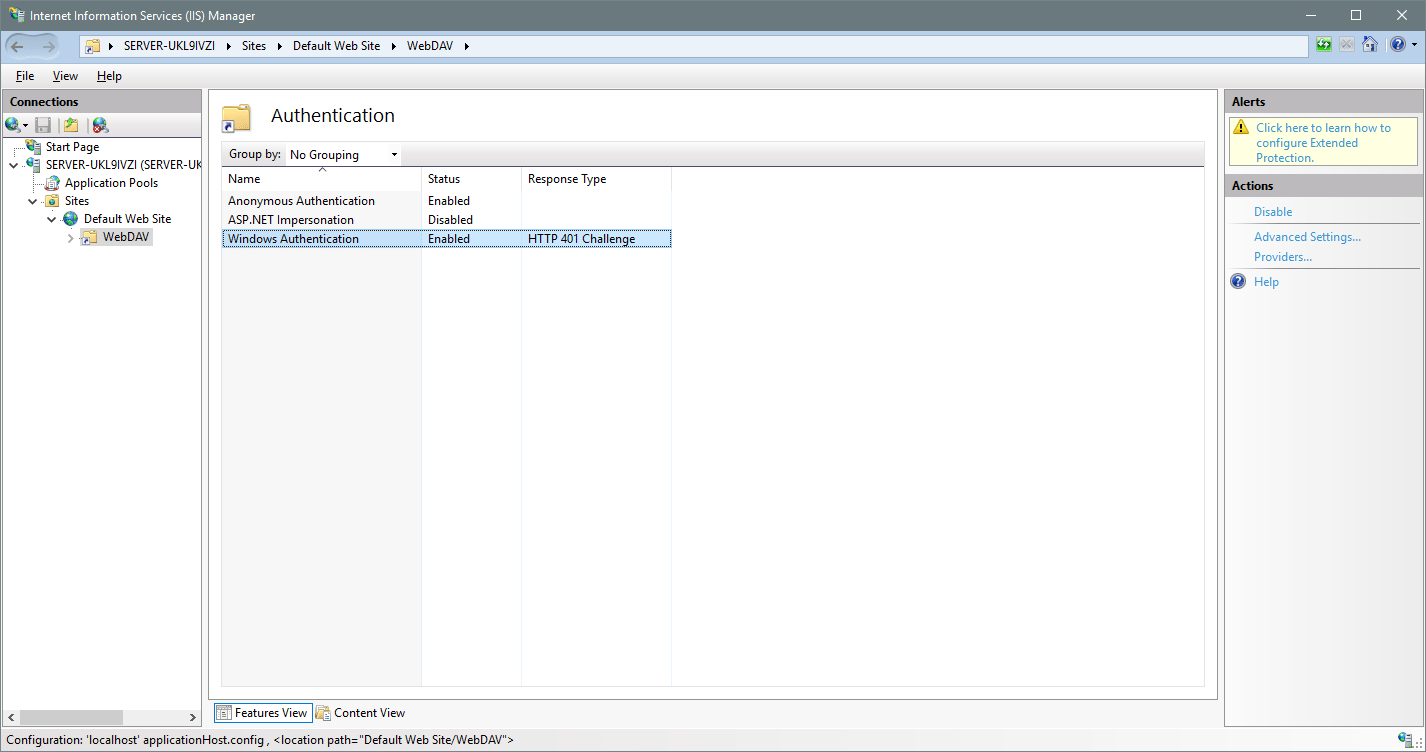 When the Authentication feature opens, make sure that Windows Authentication is enabled. If it is not enabled, select Windows Authentication, and click Enable in the Action menu.