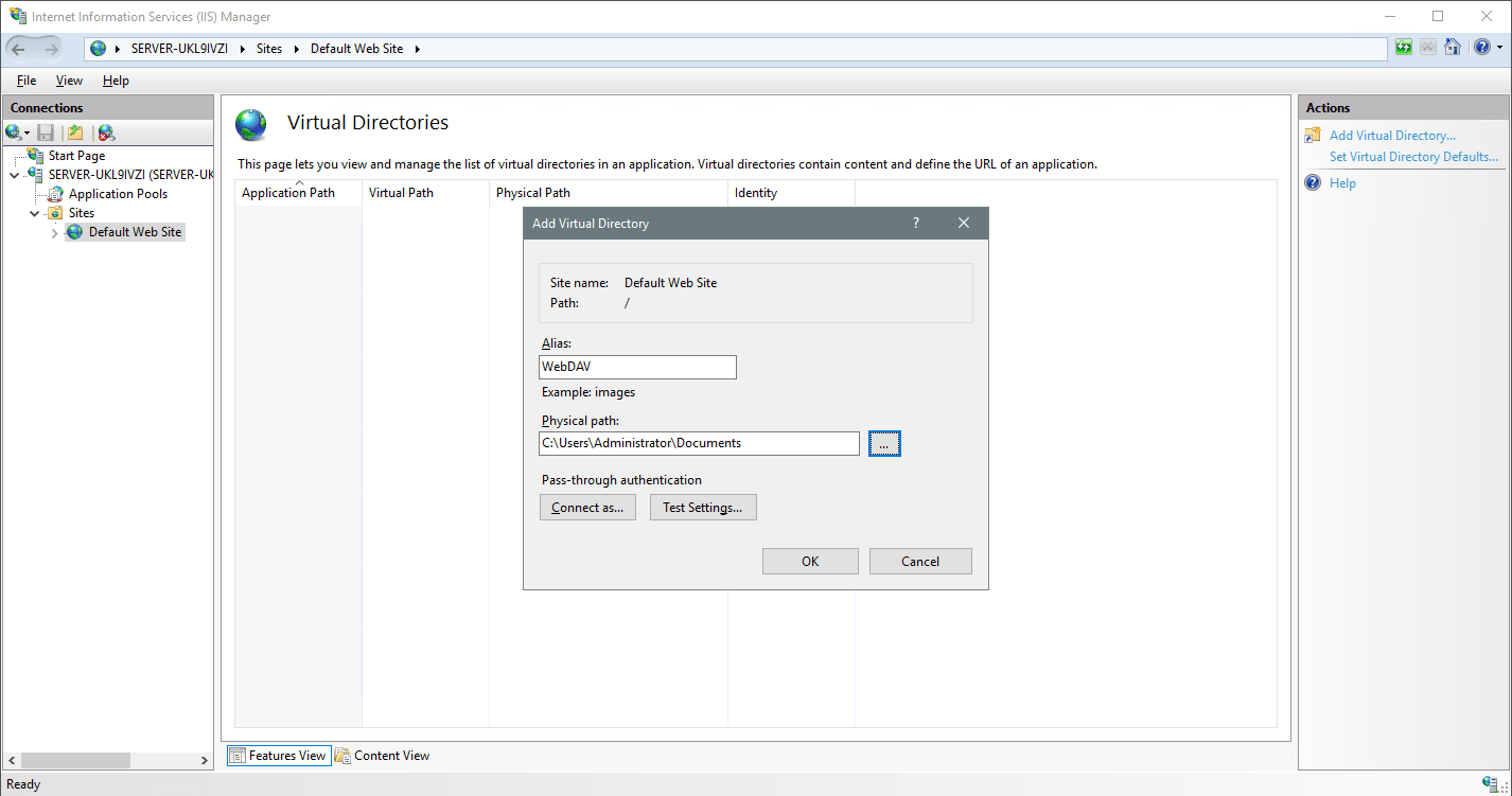 Next, open the IIS Manager to create a Virtual Directory. To do this, navigate to Default Web Site (or your site) in the left menu, and then click View Virtual Directory on the left side of the menu. By clicking on Add Virtual Directory (also in the left menu) you can now add a new directory. This will later be the directory to be shared via WebDav. The alias that is given here is later part of the URL. In this example, the corresponding address would be