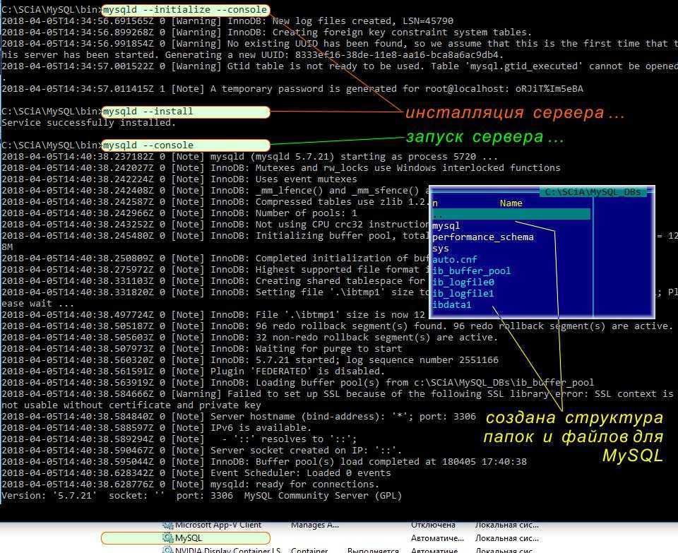 После этих трех команд сервер «стал», но не готов к работе: MySQL — появился в списке служб. Нужно установить пароль для root, добавить пару администраторов и перезагрузить компьютер.