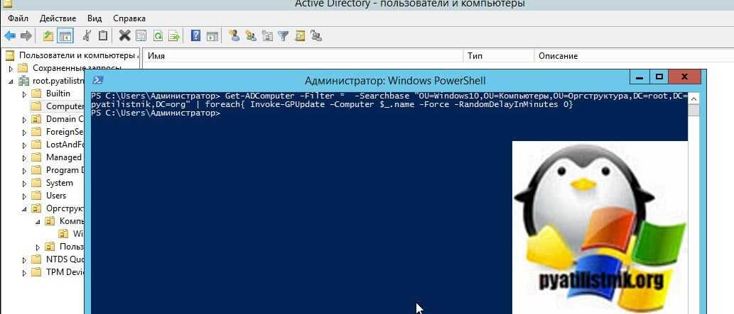Get-ADComputer –Filter * -Searchbase «OU=Windows10,OU=Компьютеры,OU=Оргструктура,DC=root, DC=pyatilistnik,DC=org» | foreach{ Invoke-GPUpdate –Computer $_.name -Force -RandomDelayInMinutes 0}