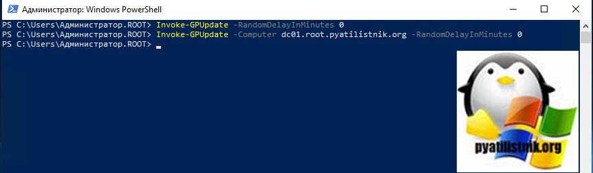 Invoke-GPUpdate -Computer dc01.root.pyatilistnik.org –RandomDelayInMinutes 0