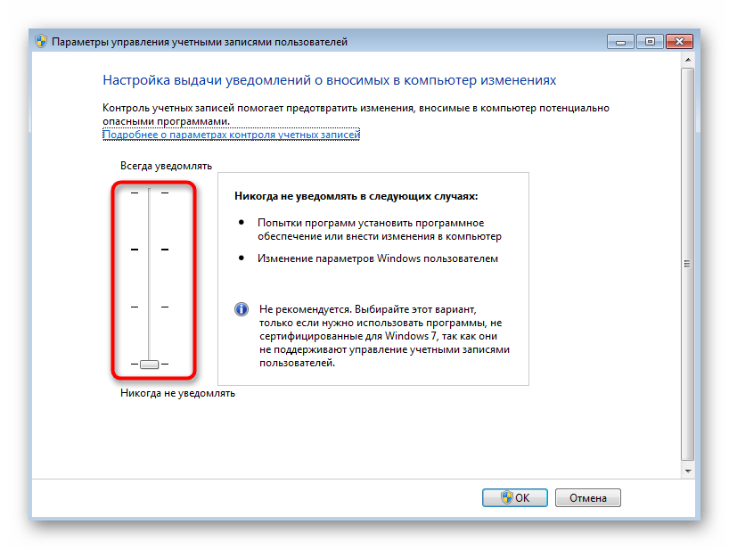 Это еще один способ, завязанный на привилегиях пользователя и администрировании операционной системы. По умолчанию администратор получает уведомления обо всех изменениях, и некоторые из них могут даже автоматически блокироваться, если для компонента контроля учетных записей установлен параметр наивысшей безопасности. Изменяется это вручную путем редактирования всего одной настройки.