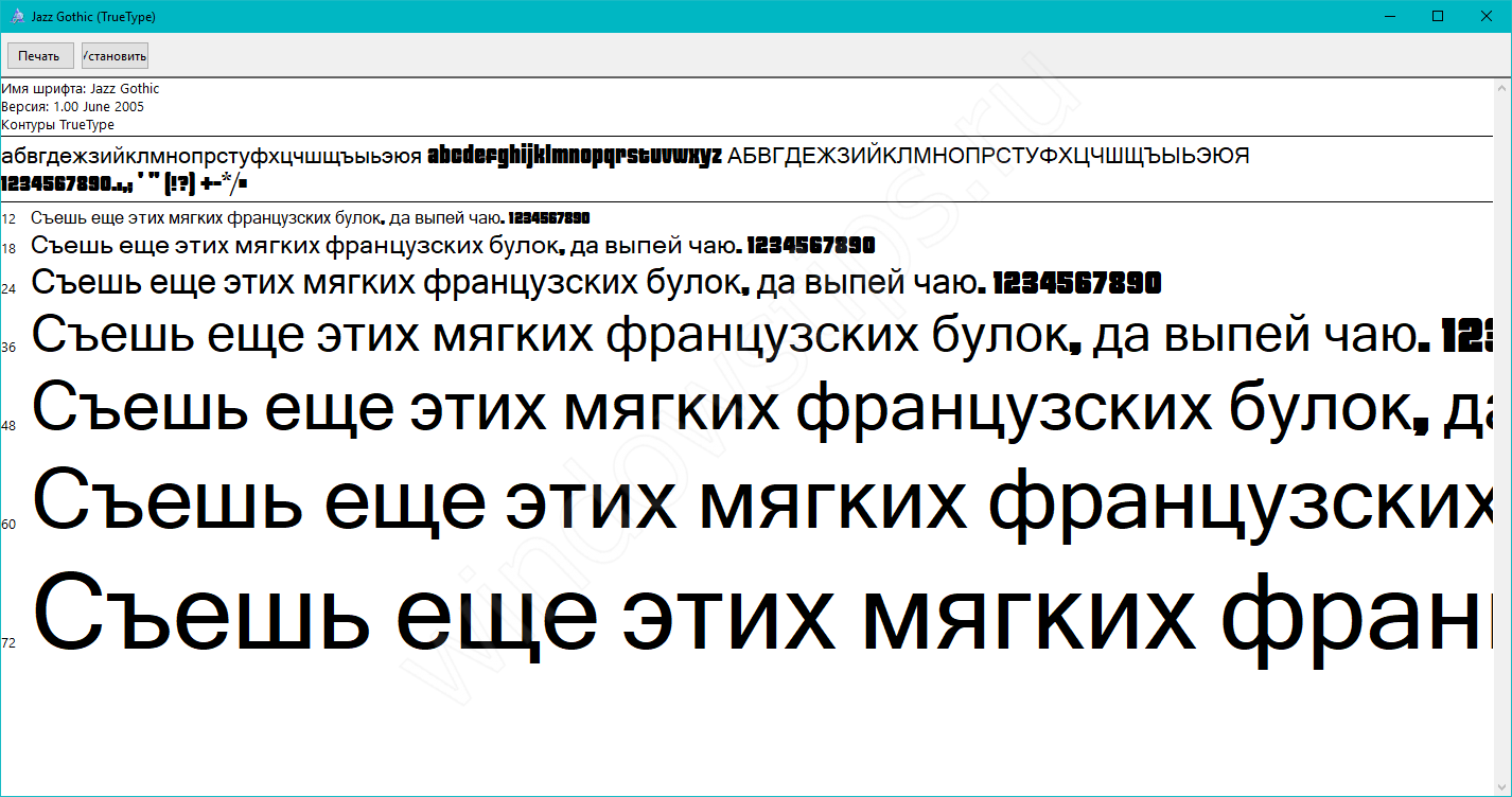 Нажав кнопку «Печать» (Print), можно распечатать образец шрифта.
