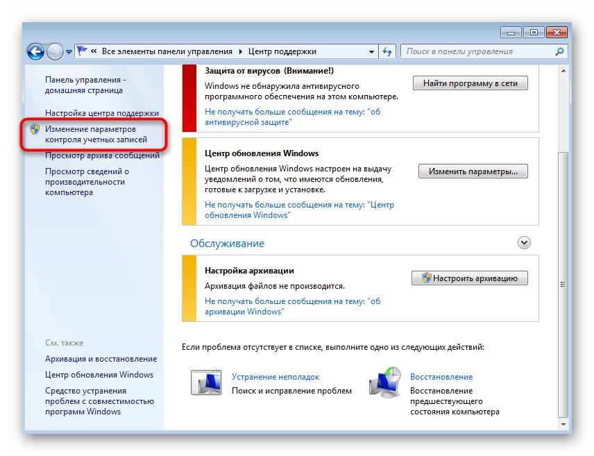 Через панель слева перейдите в «Изменение параметров контроля учетных записей».