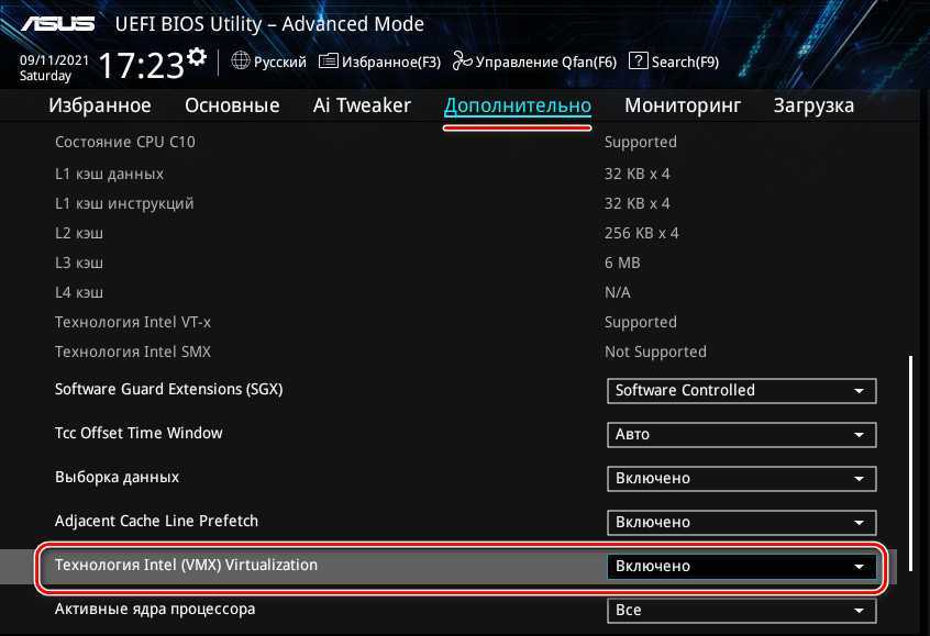 Для поставленной задачи нам нужен компьютер минимум с двумя ядрами процессора и «оперативкой» 8 Гб. В исключительных случаях можно 6 Гб, Hyper-V всё равно использует память динамически, просто тогда перед запуском виртуальной машины необходимо оставить в хост-системе минимум нагрузок. Дальше нам нужна включённая в BIOS технология виртуализации, если процессор поддерживает таковую, а большинство десктопных поддерживает. Чтобы включить, ищем виртуализацию в расширенных настройках BIOS. На платформах Intel ищем по названию Intel (VMX) Virtualization, возможно, VT-x или Intel Virtualization Technology. На платформах AMD ищем по названиям AMD Virtualization, возможно, SVM, либо же AMD-V.