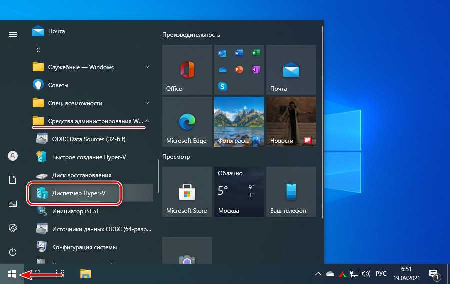 После запуска компьютера ищем Hyper-V через системный поиск или открываем в меню «Пуск», штатный гипервизор будет в числе средств администрирования.