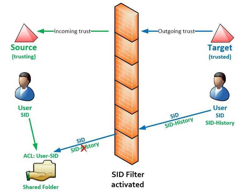 For a newly set up trust between two domains or two forests, the SID Filtering is activated by default. The filter removes all foreign SIDs from the user’s Access Token while accessing a resource via a trust in a trusting domain. An example for a foreign SID would be the SID-history of a migrated user-account. The SID-history of user accounts and groups enables access to resources in the trusting domain – in case the filtering is deactivated.