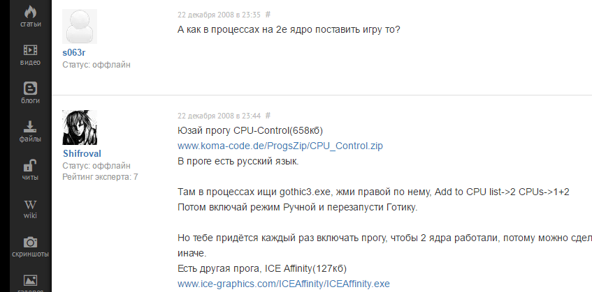 На скриншоте выше пользователь s063r посчитал, что игра не задействует второе ядро процессора. Shifrovalответил, что нужно использовать программу CPU Control.