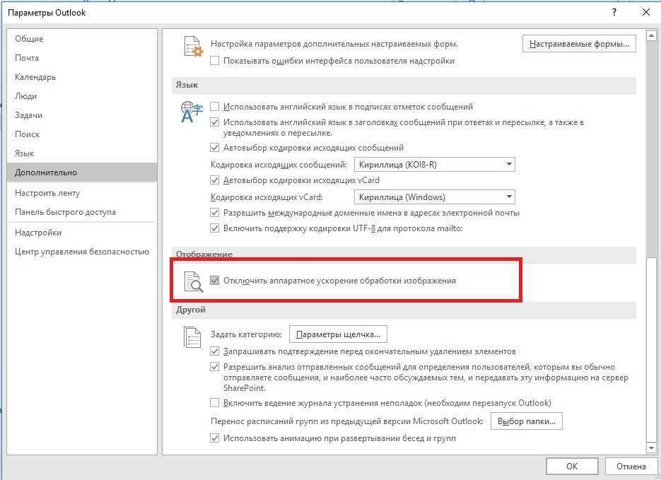 В таком случае рекомендуется попробовать отключить режим аппаратного ускорения в MS Office. Для этого, в настройках Outlook поставьте галку: