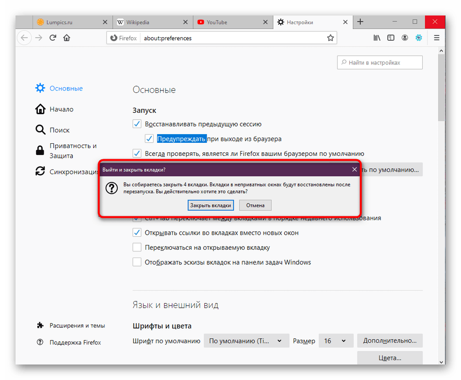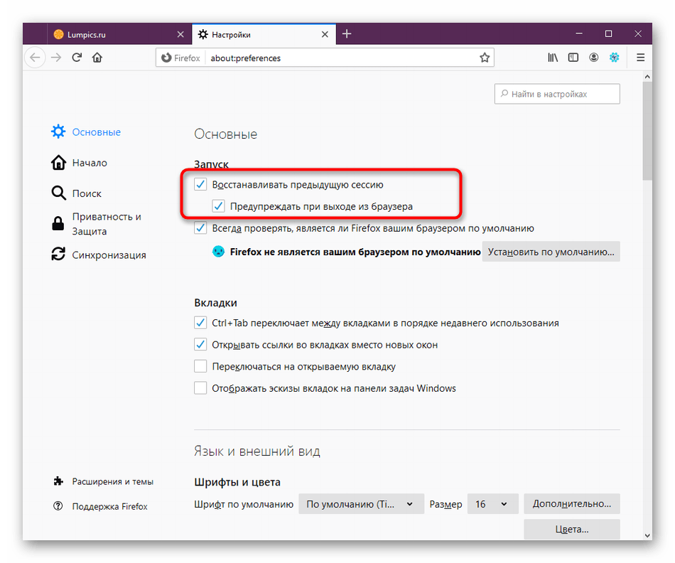 Вверху в разделе «Основное» вы увидите пункт «Восстанавливать предыдущую сессию» и под ней будет «Предупреждать при выходе из браузера». Первый параметр активируйте обязательно, а второй по желанию.